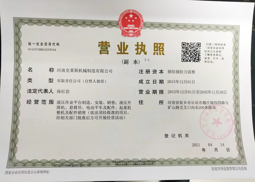 河南克萊斯機械制造有限公司位于河南省長垣市魏莊工業園區,公司注冊資金捌佰捌拾萬元整,在職員工40余名,擁有研發設計團隊,是一家生產液壓升降作業平臺及旋臂起重機生產銷售的廠家。  公司主要產品有:固定導軌式液壓升降作業平臺、移動式液壓升降平臺、車載式液壓升降平臺;定柱式懸臂吊、墻壁吊、電動平車、登車橋等?! 【嫉脑O備,嚴格的管理是公司得以不斷發展壯大、產品能夠贏得用戶依賴的根本所在。  “精確、...... <了解更多>